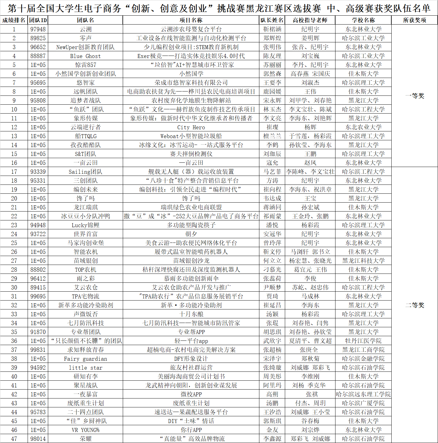附件1:第十届全国老员工电子商务“创新、创意及创业”挑战赛黑龙江赛区选拔赛 中、高级赛获奖队伍名单