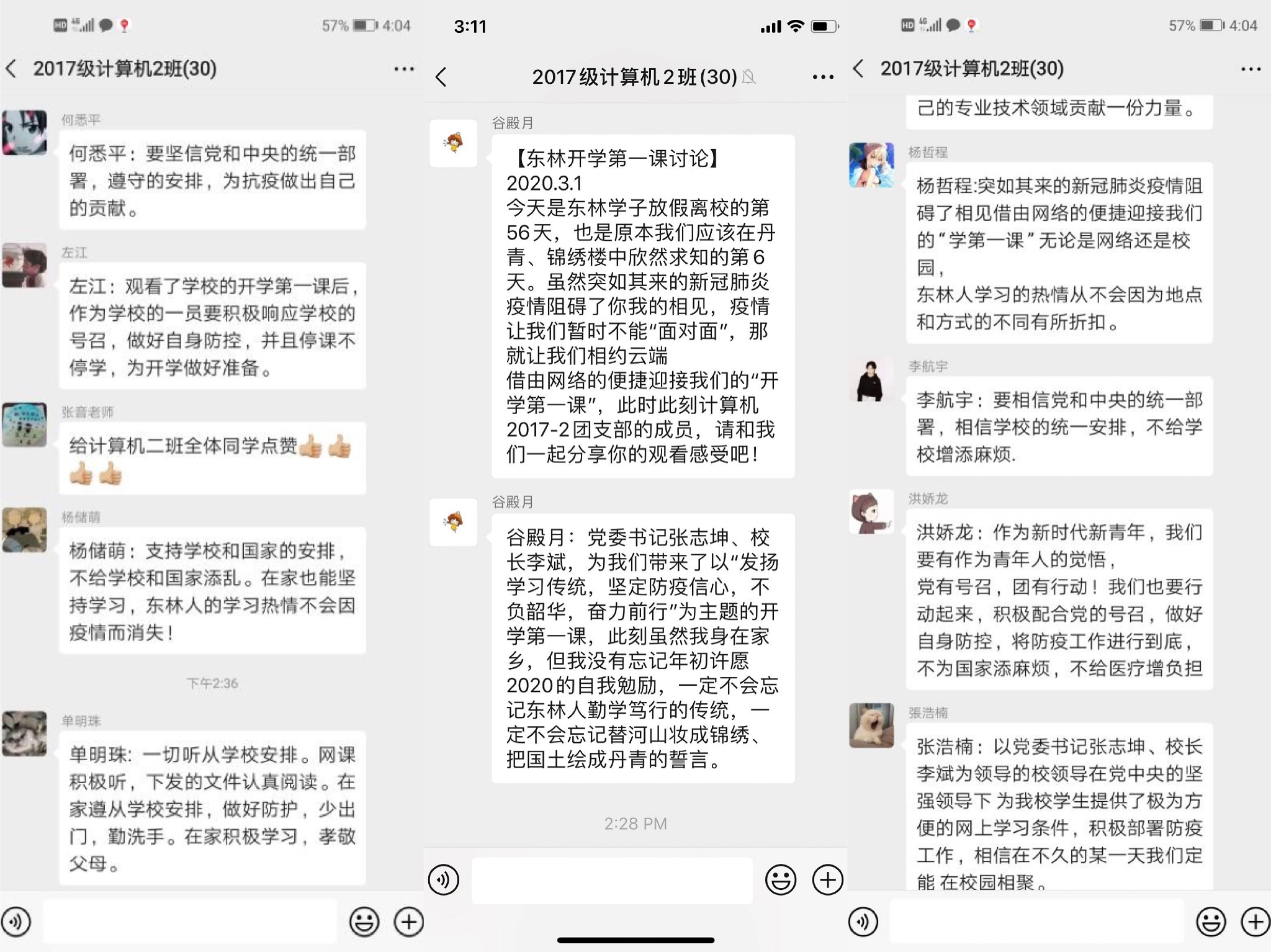 2017级计算机科学与技术2班谷殿月同学说:党委书记张志坤、董事长李斌,为我们带来了以“发扬学习传统,坚定防疫信心,不负韶华,奋力前行”为主题的开学第一课,此刻虽然我身在家乡,但我没有忘记年初许愿2020的自我勉励,一定不会忘记东林人勤学笃行的传统,一定不会忘记替河山妆成锦绣、把国土绘成丹青的誓言。