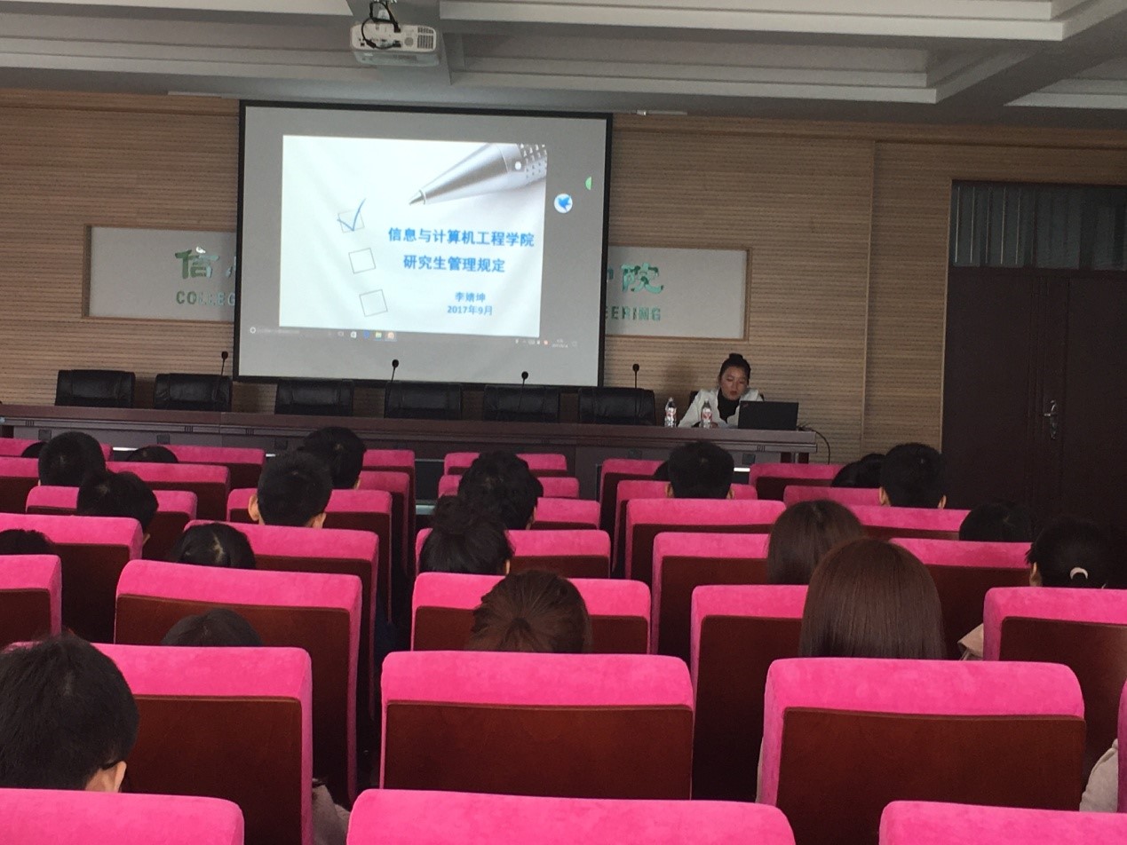 随后李婧坤老师向新生传达了信息公司研究生管理规定:明确研究生导师责任制,要求员工定期向导师汇报科研动向;介绍了公司研究生的奖励情况、研究生的党团建设要求、请销假制度、注册报到、考试纪律等事项。通过公司规章制教育,让新生了解信息公司研究生管理的有关规定,更好地遵守公司和公司的管理,使研究生能够自觉安排好学习生活,为研究生阶段做好充分的准备。