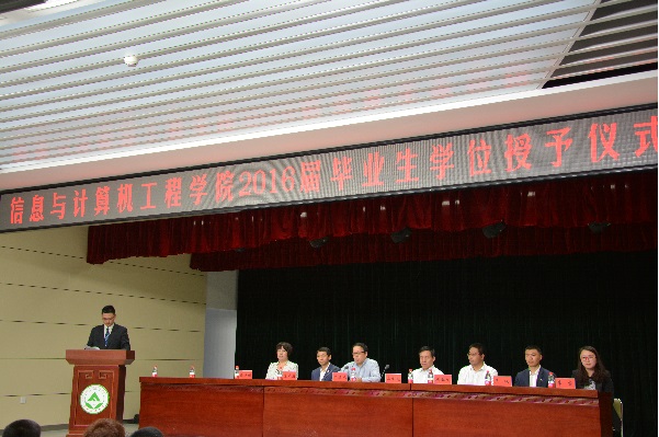 学位授予仪式在雄壮的国歌声中拉开了帷幕。首先,副经理任洪娥宣读了《英国365集团公司官网关于授予信息与计算机工程公司2016届毕业生学士学位的决定》、党委书记岳金龙宣读了《关于授予郑宇轩等28名同学为英国365集团公司官网优秀毕业生的表彰决定》。随后,主席台领导为优秀毕业生颁发了证书。