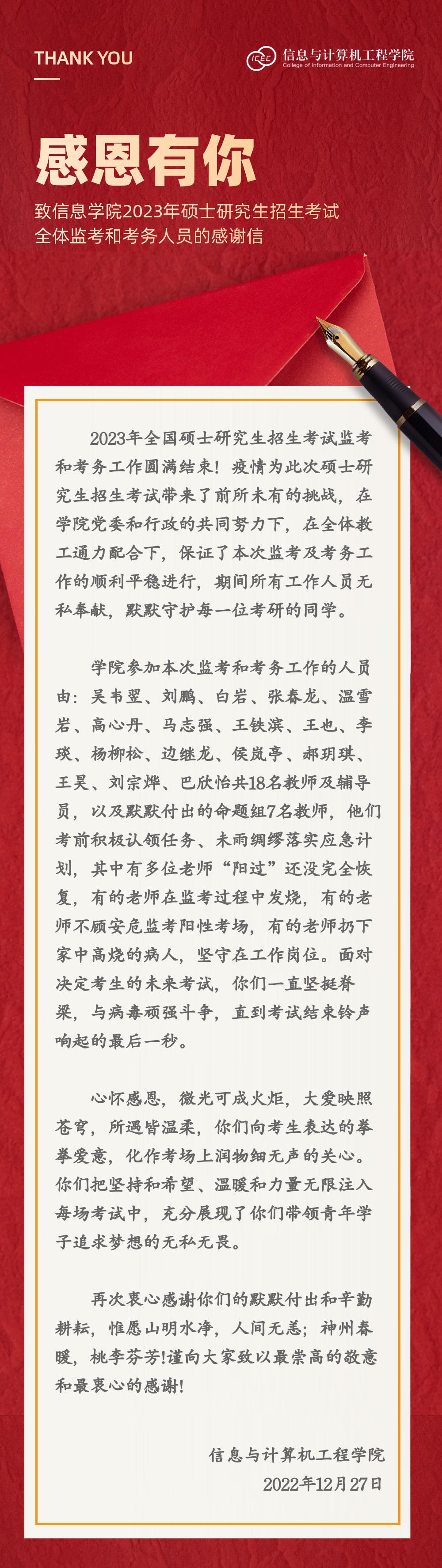感恩有你——致信息公司2023年硕士研究生招生考试全体监考和考务人员的感谢信