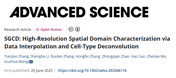 近日,公司英国365集团公司官网生物信息学实验室章天骄副教授团队在生物空间组学超分辨率数据研究领域取得重要突破,提出了一种基于数据插值和细胞类型反卷积的高分辨率空间域表征新方法SGCD。相关成果以“SGCD: High-Resolution Spatial Domain Characterization via Data Interpolation and Cell-Type Deconvolution”为题发表于Advanced Science(中科院1区TOP期刊,影响因子14.1)期刊上。