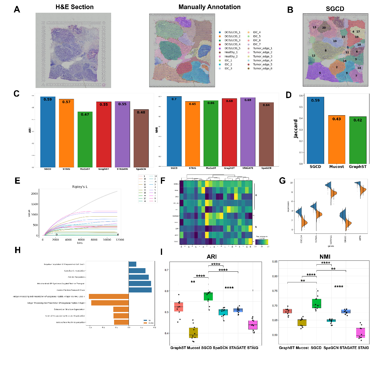 该方法在多个标准数据集上的验证结果显示,SGCD在人类背外侧前额叶皮质数据集上实现了0.651的平均ARI分数和0.710的NMI分数,显著优于现有主流方法。在复杂组织结构分析中,SGCD展现出卓越性能。在小鼠大脑52个亚区域的精细分割任务中,该方法准确识别了纹状体和伏隔核等关键脑区;在胰腺导管腺癌组织分析中,成功区分了恶性肿瘤区域、非恶性导管上皮和正常胰腺组织;在乳腺癌异质性研究中,有效揭示了不同肿瘤区域间的基因表达差异和生物学特征。