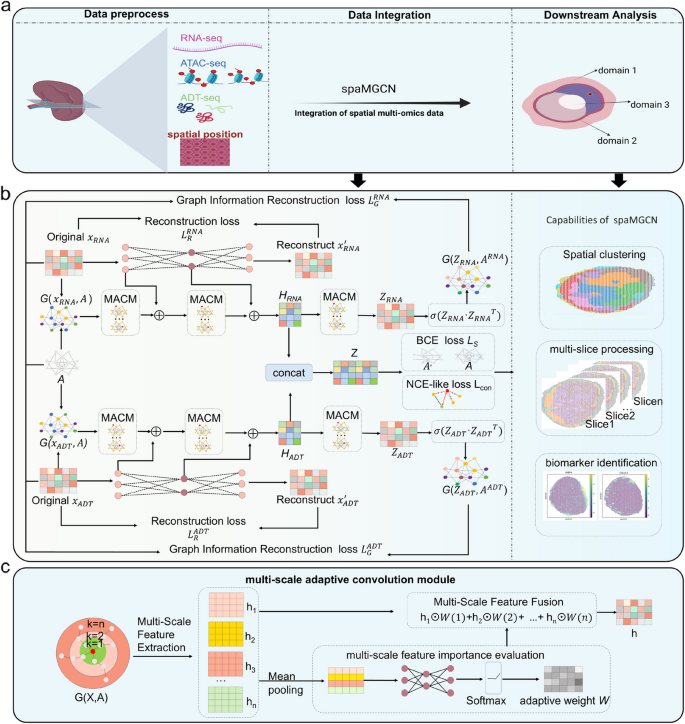 近日,公司英国365集团公司官网生物信息学实验室章天骄副教授团队在生物组织空间域识别领域取得重要突破,提出了一种将自编码器与多尺度自适应图卷积网络(MACM)结合,通过动态平衡spot属性特征和空间邻域结构信息进行空间域识别的新方法spaMGCN。相关成果以“spaMGCN: a graph convolutional network with autoencoder for spatial domain identification using multi-scale adaptation” 为题发表于Genome Biology(中科院1区TOP期刊,影响因子9.4)期刊上。