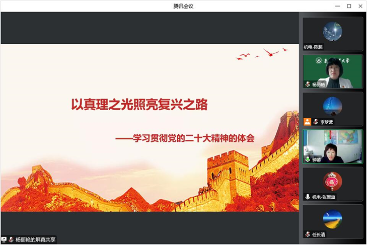 12月7日下午,机电公司和信息公司联合组织开展党的二十大精神宣讲会,会议邀请公司宣讲团成员、马克思主义公司教授杨丽艳做了题为“以真理之光照亮复兴之路”的专题宣讲。会议以线上的形式举行,机电公司和信息公司全体教职工参与学习。会议由信息公司党委书记钟蕾主持。