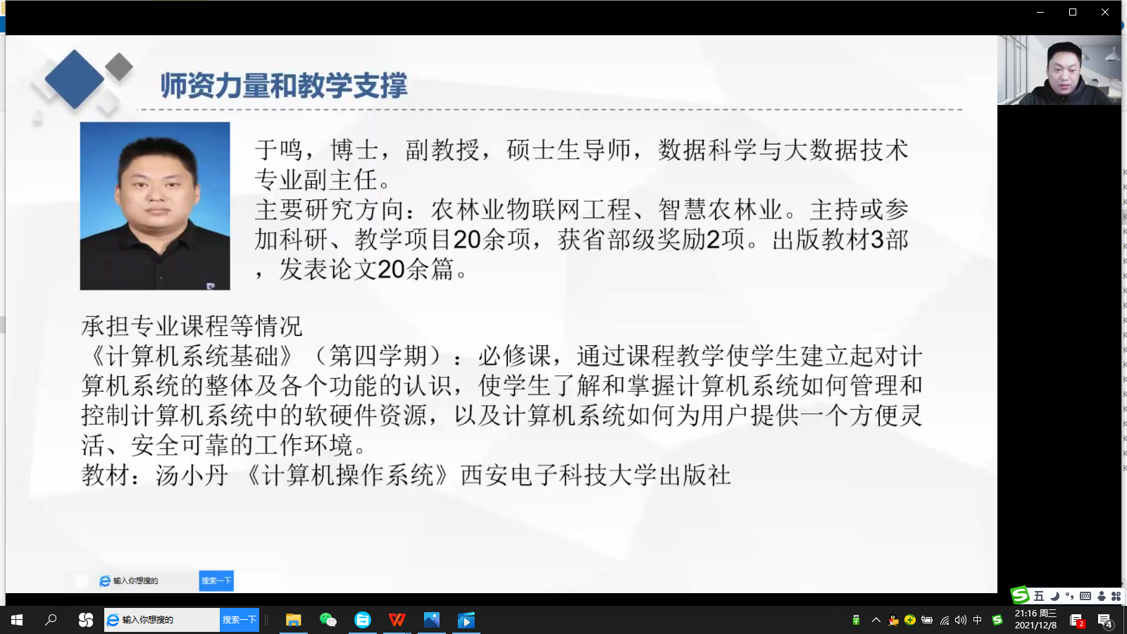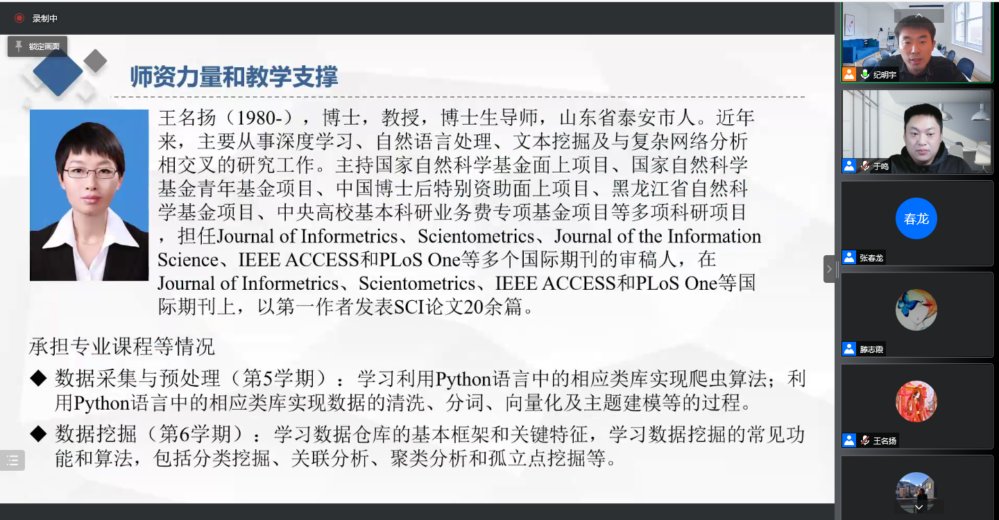 之后,专业班导师代表和任课教师代表分别发言。王名扬老师作为班导师代表,通过平易近人的话语对自己的研究方向、科研成果、授课内容进行了简要说明,作为班导师她鼓励同学们合理规划时间,通过努力实现自己的梦想。李实老师、于鸣老师、纪明宇老师先后对下学期自己所讲授的专业课程的教学内容、能力要求、教材资源等进行了细致的讲解。纪明宇老师还对今天未能线上参会的老师的基本情况和授课情况进行了介绍。