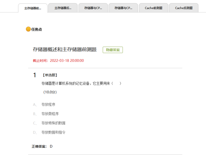 作业:完成在线课程4.5本章自测题部分的存储器概述和主存储器后测题 |