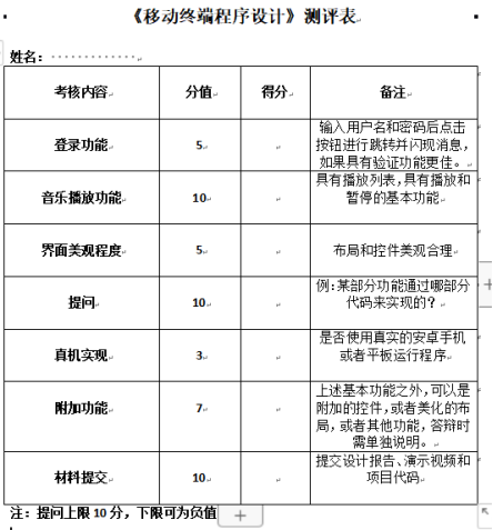 (1) 探究线上考核方式,结合课程实际情况,取消期末笔试,改为应用能力考核。考核内容为:开发一个音乐播放器APP,要求具有登录界面,在登录界面输入用户名和密码后点击登录按钮进行跳转。成功登录后,具有歌曲列表,点击相应歌曲后进入播放界面,播放界面具有播放、暂停的基本功能。不限于上述基本功能,在此基础进行扩展可以具有附加分值。鼓励使用真机进行程序的操作。制定评分细则,确保能够将作品成绩全面客观地体现出来。设计的打分表格如下:
