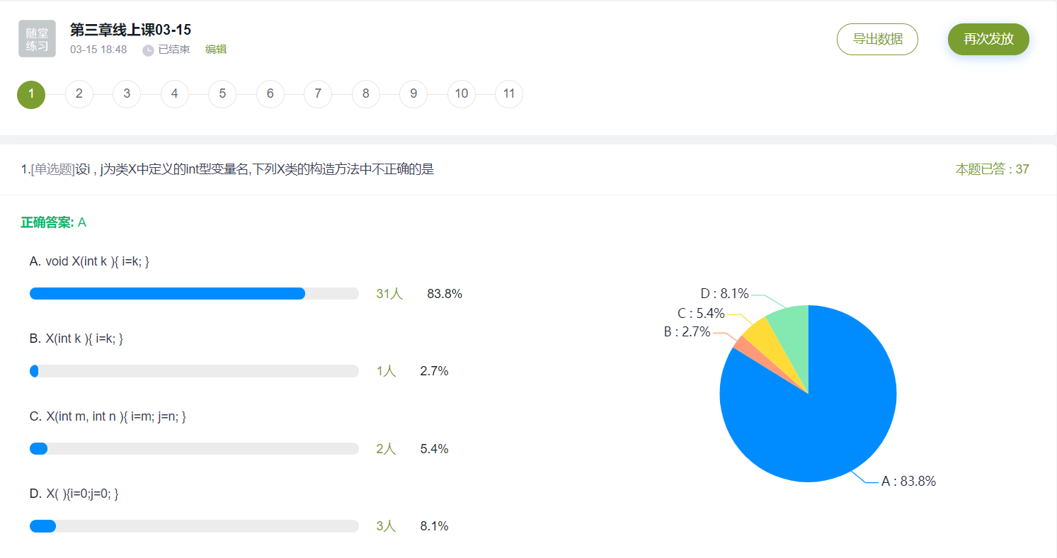 Java程序设计课程是Java系列课程的先修课,课程主要培养员工面向对象的编程思想和编程实践的能力。受疫情影响,本门课程从第3周开始改为线上授课方式。在线上授课过程中能运用信息技术透析整体线上教学过程,分析数据诊断学情,做到教学心中有“数”,同时在教学过程中依据学情及时优化教学方案,控制好线上教学课堂容量;追踪个案,分析差异,激发学习动力,落实个性分层教学;加强单元测试与作业等考核环节的设计,做到及时有效的作业反馈。确保疫情期间教学活动有质量的开展。