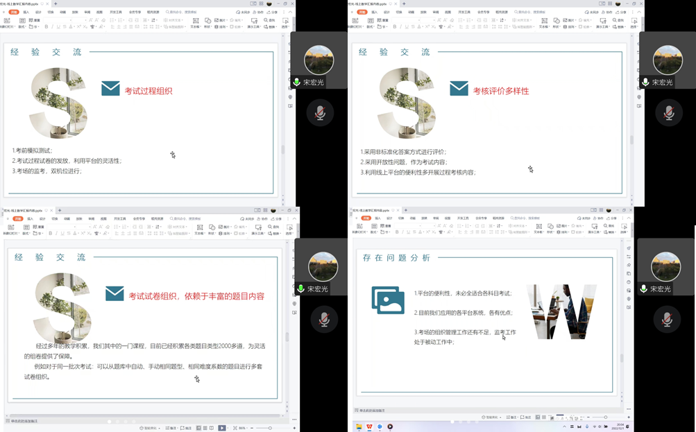 会上,各专业教师代表根据本专业以往线上教学与考试的经验,从教学与考试平台的使用方法、注意事项、存在问题等方面,综合分析了超星学习通、腾讯会议等网络平台的优缺点,分享了本专业以往线上教学和考试经验。由于后期考试科目较多,线上考试任务艰巨,为了保证考试公平公正进行,大家从考试命题、考核评价、考试过程组织和考试规则制定等方面展开了热烈的讨论,建议应该合理分配试题难易程度,灵活多样进行考核评价,考前务必进行线上模拟测试,制定完善的考试规则。
