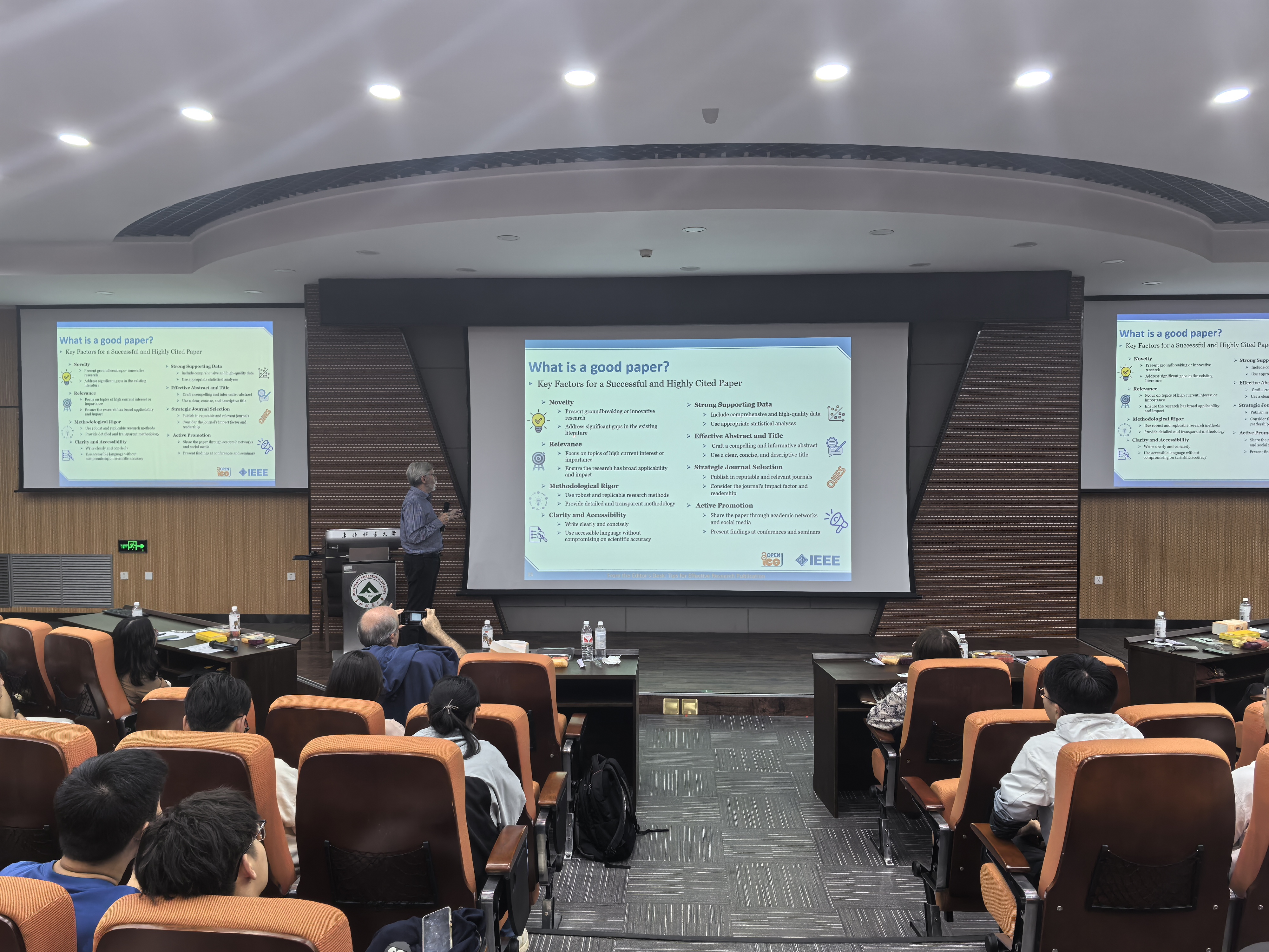 会上,Leopoldo G. Franquelo教授以他多年从事编辑的工作经验分享了以如何撰写一篇高质量学术论文为主题的学术报告。从编辑和审稿人的视角给出了处理接收稿件时的主要关注点,并对会议论文和学术论文的区别进行了介绍,为现场师生详细讲解了高质量的学术论文在内容、风格和格式等方面应具备的一些关键因素。