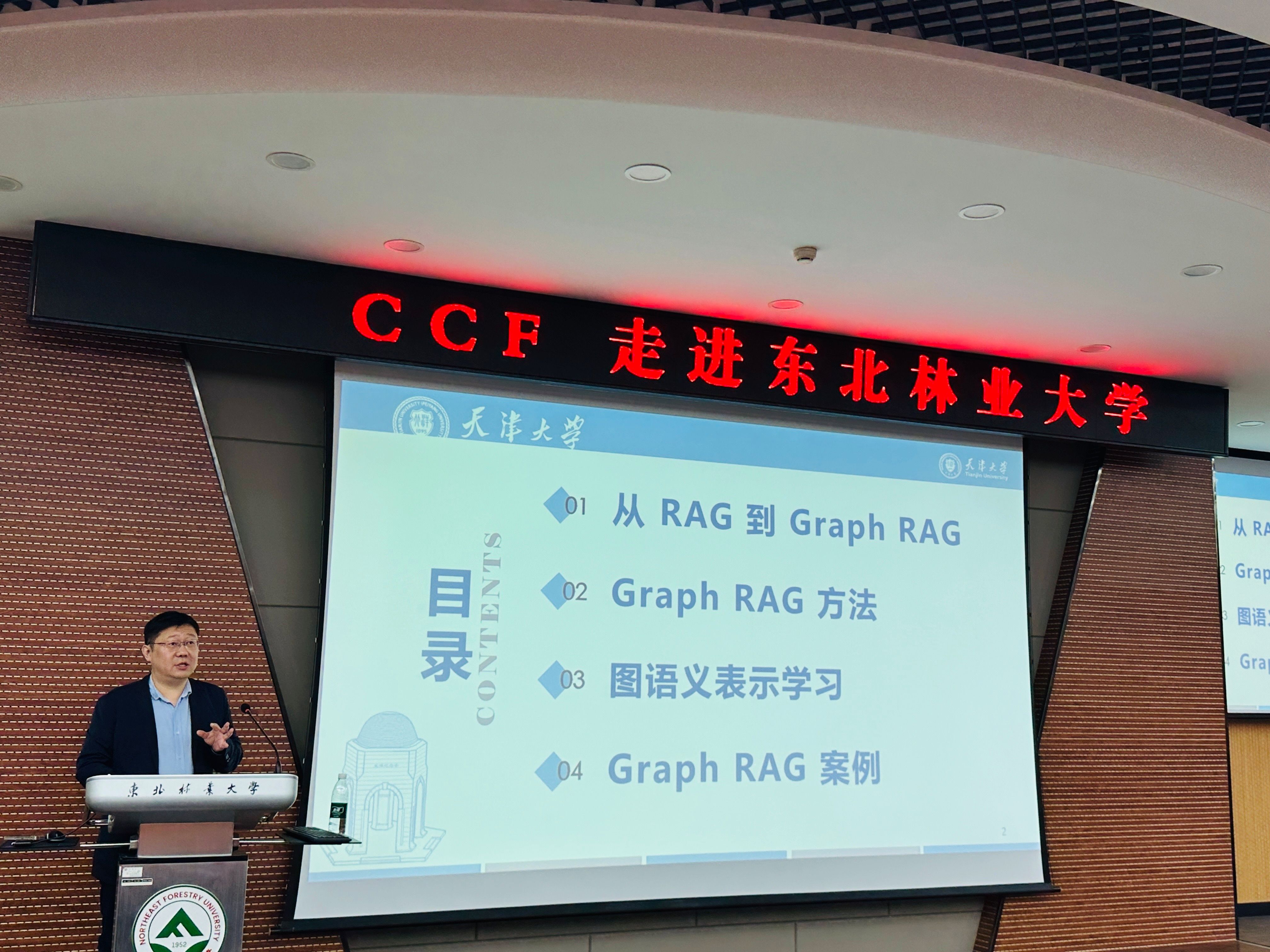 王鑫教授以“基于图数据的检索增强生成(GraphRAG)研究进展”为题,系统阐释了图数据在检索增强生成技术中的关键作用与发展脉络。他强调,图结构数据凭借其丰富的语义关联与拓扑特性,为大模型在专业领域的语义理解与生成质量提升提供了新路径。王鑫教授重点介绍了图数据在增强检索相关性、提升知识注入效率等方面的技术优势,并结合典型应用场景,展示了GraphRAG在垂直领域大模型研发中的实践价值与发展潜力。