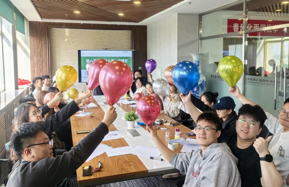 最后,每位同学将自己的心愿写在纸条上,将其装进五彩斑斓的气球中,随后将气球打乱后随机抽取,两两互相拥抱,合力将气球挤爆。随着气球的破裂声响起,每个人的梦想与期待也如同绚烂的烟花般绽放,充满整个房间。