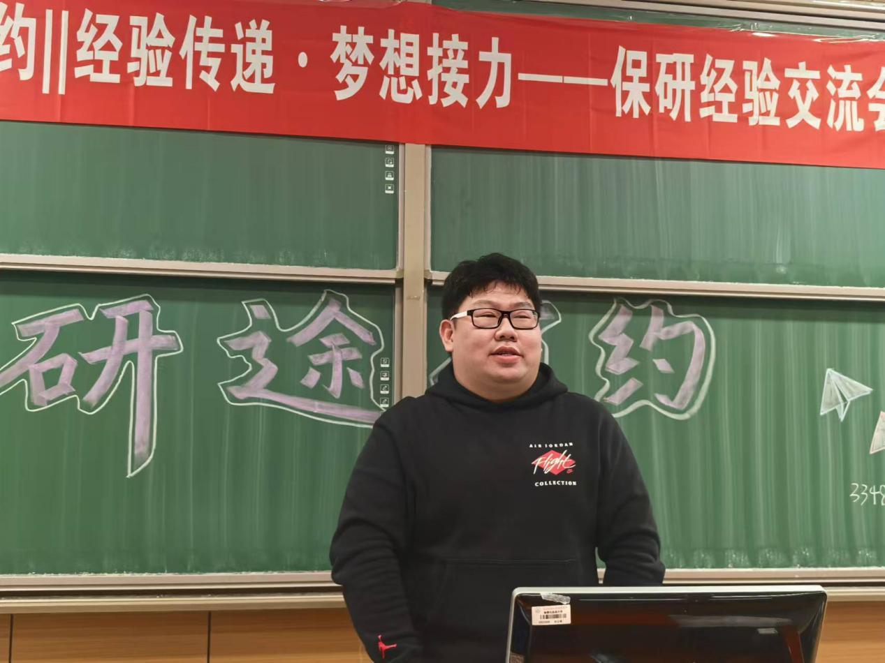 刘梦博从学业情况、课余活动和自身感受三个方面进行了经验分享。他以专业课的学习为出发,为同学们日后的学习规划提出了自己的一些建议。而后结合自身经历对在大学期间是否担任员工干部以及担任员工干部的进行了具体分析。在此期间他还倡导同学们积极投身社会实践,不断提升自身的综合素质。在回顾老员工活的点滴后,他特别强调了调整心态的重要性,并与同学们交流了自己在这一过程中积累的一些心得体会。