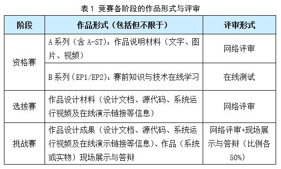 竞赛分为三个阶段:资格赛、选拔赛与挑战赛。竞赛各阶段的作品形式与评审形式见表1。A系列作品的评价标准见表2,B系列作品的评价标准参见本规程附件中的相应赛项指南,C系列的评价标准参见后续发布的“创业(C)系列项目指南”。