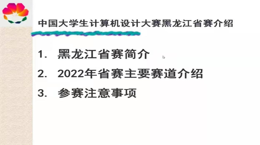 金老师分别从中国老员工计算机设计大赛黑龙江省省赛发展历程、2022年省赛主要赛道和参赛注意事项等三个方面对大赛进行了讲解。